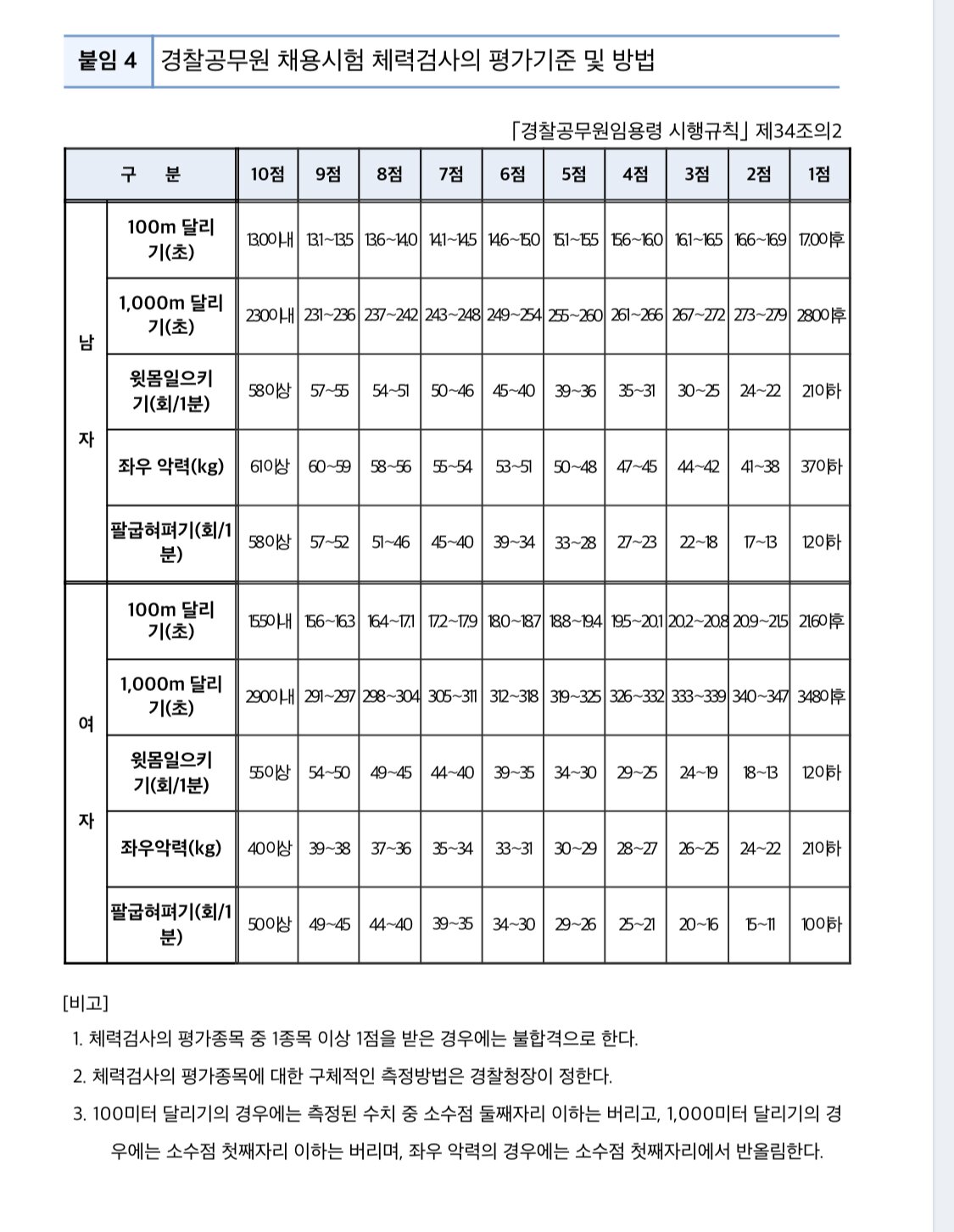 경찰공무원 체력시험의 기준은 경찰공무원 임용령 시행규칙에 따르고 있는데요 해당 법령의 내용은 다음과 같습니다.