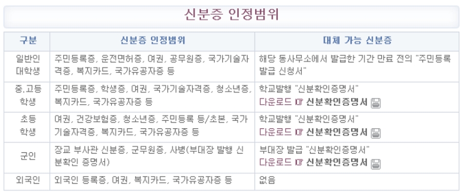 어찌되었든 젊거나 어려보이면 십중팔구 신분증 검사를 요구할텐데요 대한민국에서 신분증으로 가능한 수단은 크게 주민등록증과 운전면허증 두가지가 있습니다. 그 외에도 여러가지가 있는데 해당 인정범위는 아래와 같습니다.