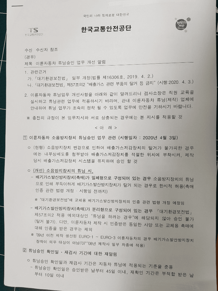 여기서 말하는 튜닝의 대상 중 촉매가 분리되는 대상은 포함이 되지 않는다는 뜻이기도 합니다. 그렇다면 저는 어떻게 되는 것일까요? 당장 오토바이를 탈 일이 없으니 무척이나 궁금해지는군요.