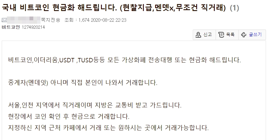 하지만 방법이 아예 없는 것은 아닙니다. 어떻게든 직거래가 가능한 사람을 찾아서 거래를 하면 됩니다. 구글에 검색해보니까 몇개의 게시글이 보이던데 비트코인 전송하는데 시간이 좀 걸리고 먹튀의 위험이 있지만 사실상 이 방법 말고는 정상적으로 환전할 방법은 없다고 보시면 됩니다.